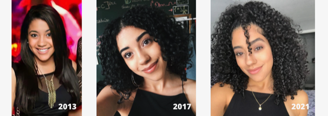 Mariana: Fui refém da progressiva e do relaxamento por 10 anos. Comecei quando eu tinha 11 anos. Lembro que não gostava do meu cabelo, nunca usava ele solto porque ele “armava”. Na escola todas as minhas amigas tinham cabelo liso, natural ou alisado, e eu não queria ser diferente. Há 15 anos não era comum ver mulheres cacheadas nas ruas para se inspirar, né?